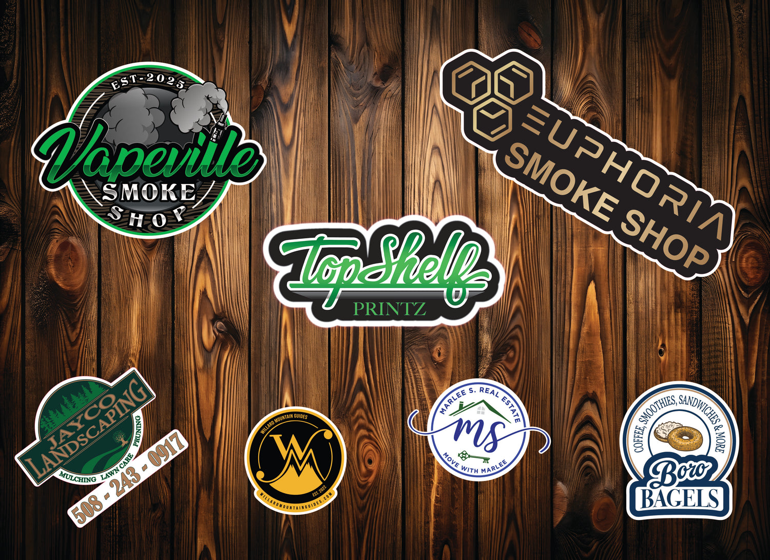 Die cut stickers are made by cutting the TopShelf Printz material around the outline of the design, creating a custom shape that fits the artwork perfectly. This process allows for intricate designs and shapes that cannot be achieved with standard stickers.